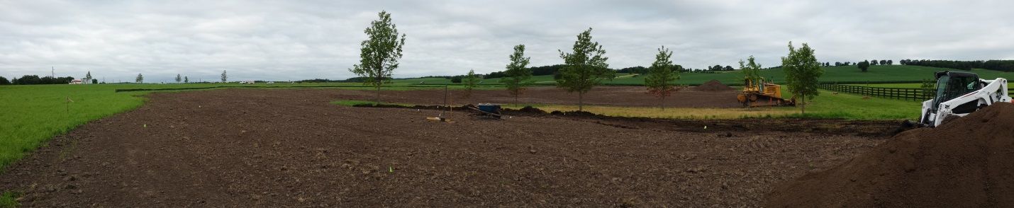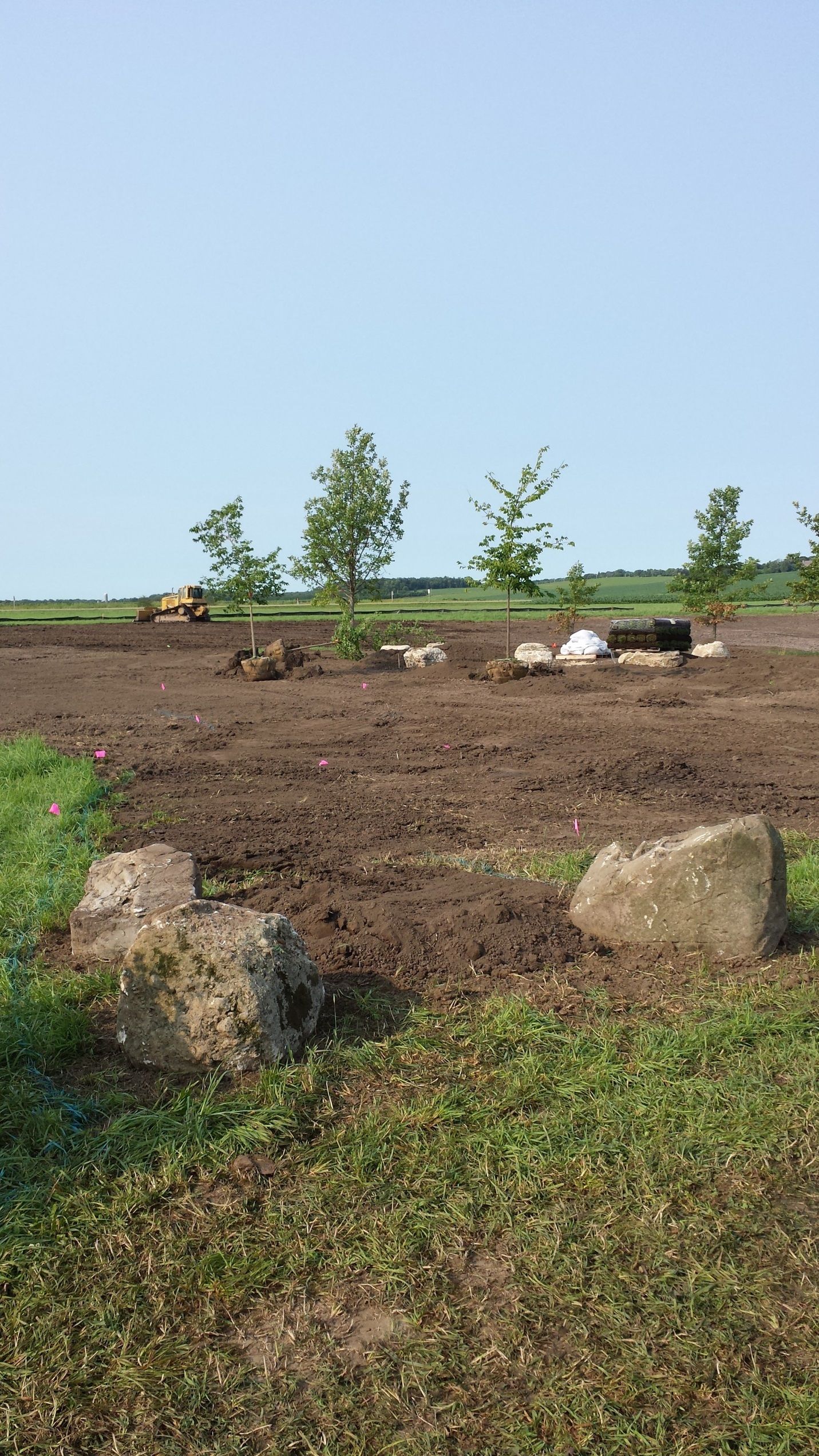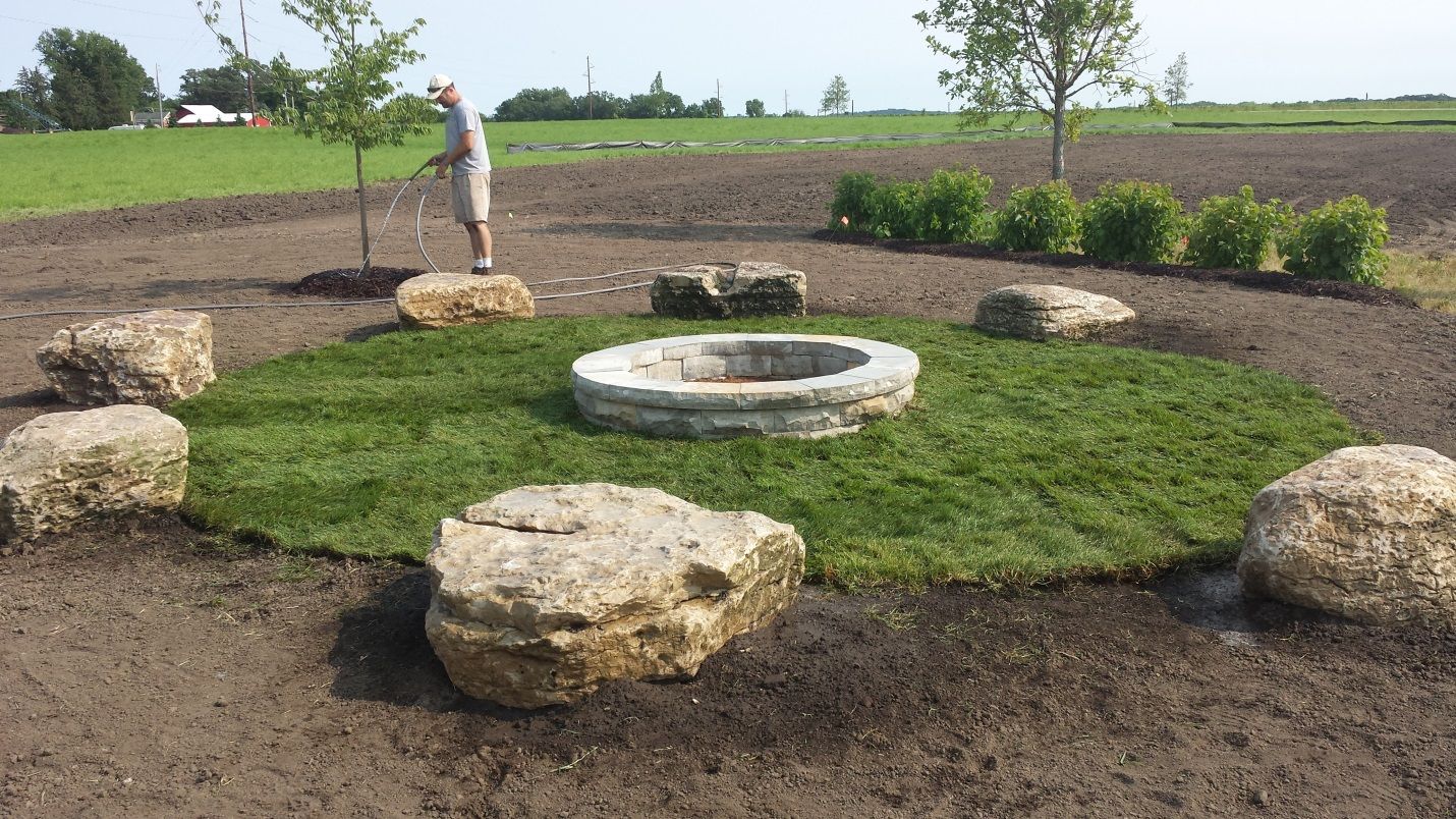 - Lastly, in order to render the firepit immediately useful, we opted to use turf sod around the firepit area and seed/straw for the lawn areas beyond the council ring. This was mainly done to reduce the likelihood of straw catching fire when using the firepit. In a few short months the lawn seed will germinate and fill in (and the straw will biodegrade and be gone).