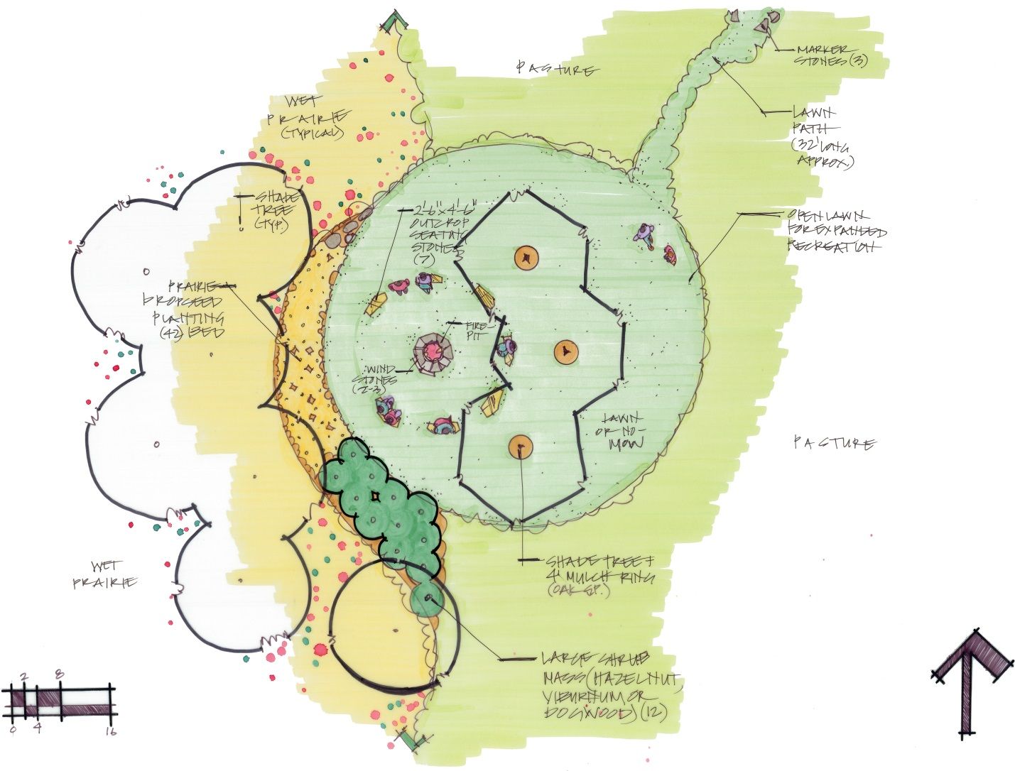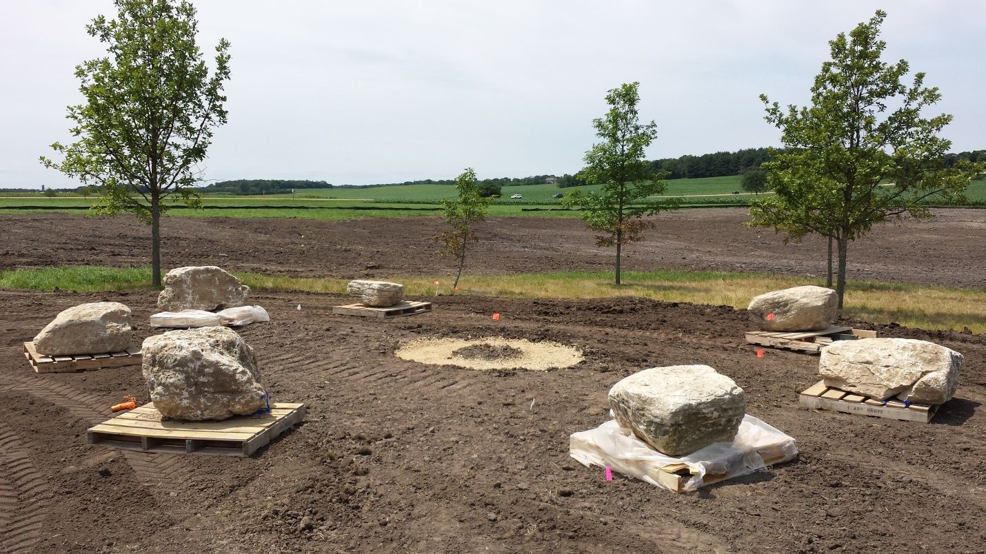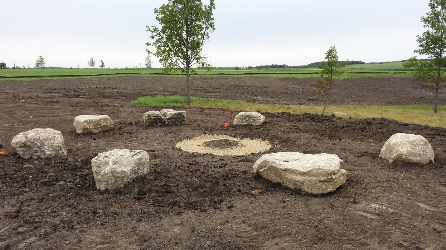 - Regional inspiration – 7 large natural stones (each weighs an average of 1800 pounds) are sited around a natural stone firepit. Room is left between each natural stone seat for additional seating etc. Each seating stone will comfortably seat two people so this space can handle smaller groups up to much larger sized.