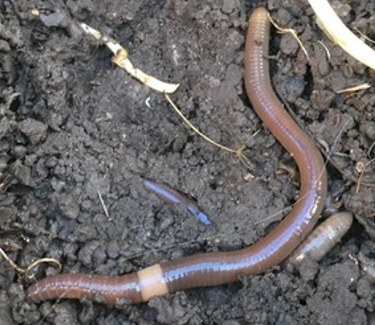 Appearance: “dry” appearance with bluish sheen. White clitellum (band in which the eggs are produced) and a length of 6-8 inches. Worms famously exhibit a fast “flailing” motion. This rapid thrashing helps escape predators with a 50% chance of survival. Presence often marked by pelleted soil clumps on soil surface.