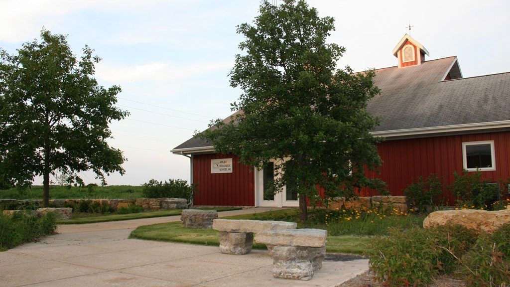 Locally quarried stones define the entry and create the feel of an ancient architectural foundation. Two mature oaks give a sense of age to the landscape, and attractive geometrically arranged perennial beds hint at AES’s broad expertise in fields as diverse as plant ecology and complex engineering. No-mow turfgrass borders the gardens, separating them from the walkway and easing maintenance. Natural stone benches provide a relaxing place to view the attractive gardens.