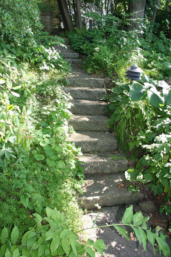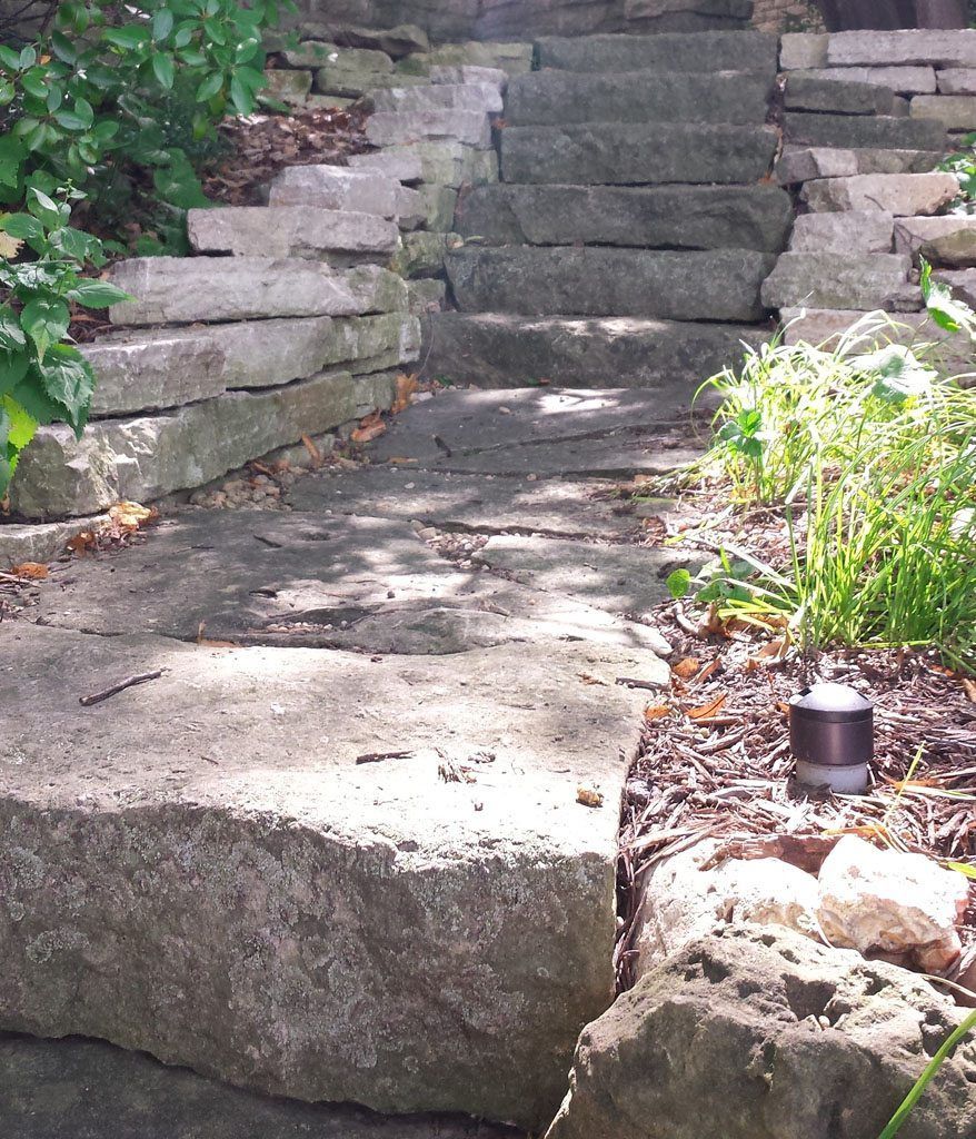 Lighting fixtures too can be incorporated into an eco-friendly landscape design. The fixtures used on this Madison property are LED and made in the USA, which means they are energy efficient and locally sourced. They have dimmers and timers for flexible lighting with the ability to shut down. The posts and railings are made of repurposed cypress siding and were specifically designed to draw on the homes unique architecture, while the post/rail lights add a warm ambiance and illuminate the steps for improved safety. Tree downlights are fixed to mature oak trees using canvas straps that can be adjusted to reduce negative impacts to the trees as they grow. Underground electric lines are routed around tree roots and through areas with less erosive potential. Local boulders, native plants, and biodegradable erosion blankets were then added to serve as a means to stabilize impacts to fragile, natural landscapes. Care and quality craftsmanship ensure impacts to existing natural hardscape features are repaired to maintain their original character for years to come.