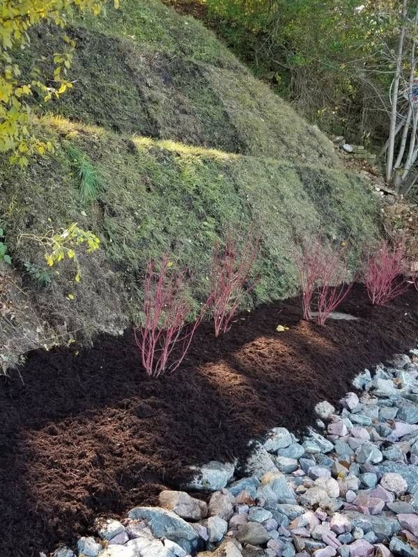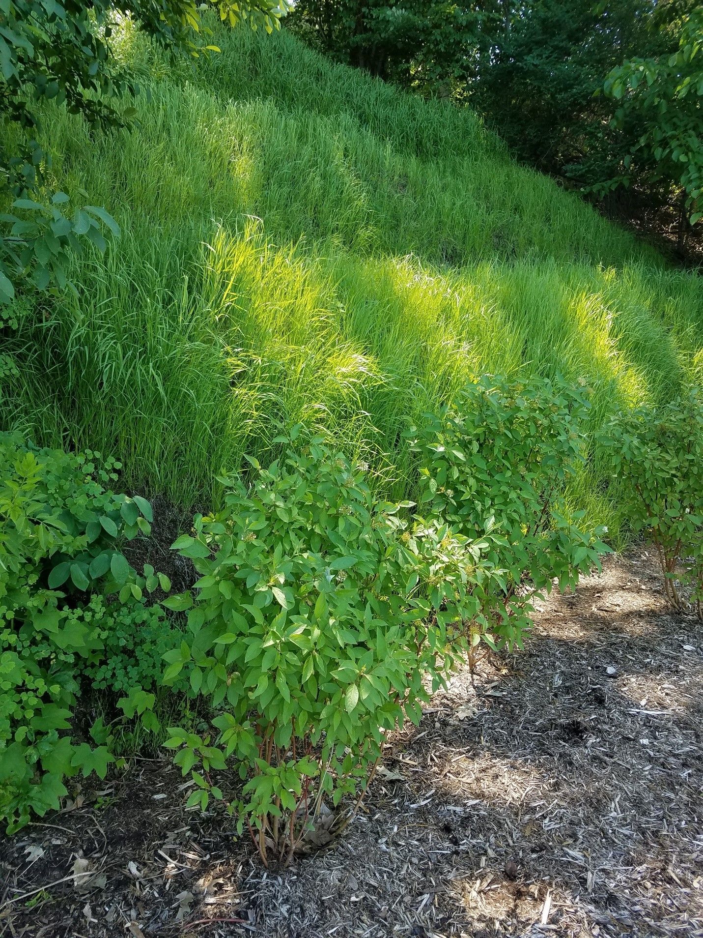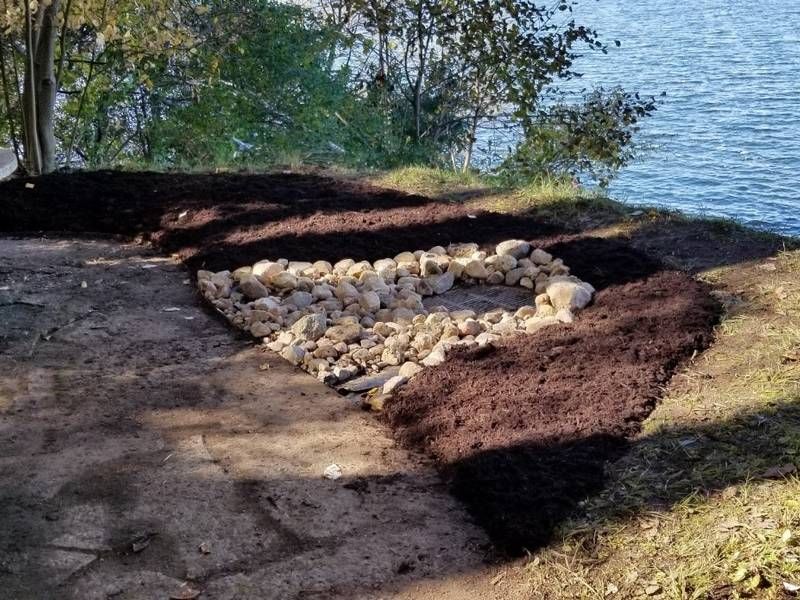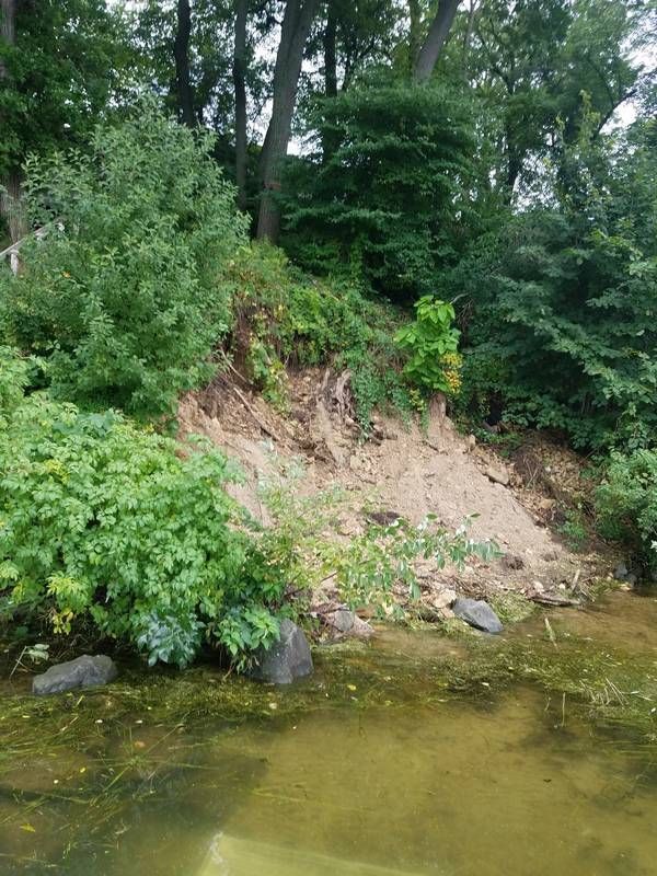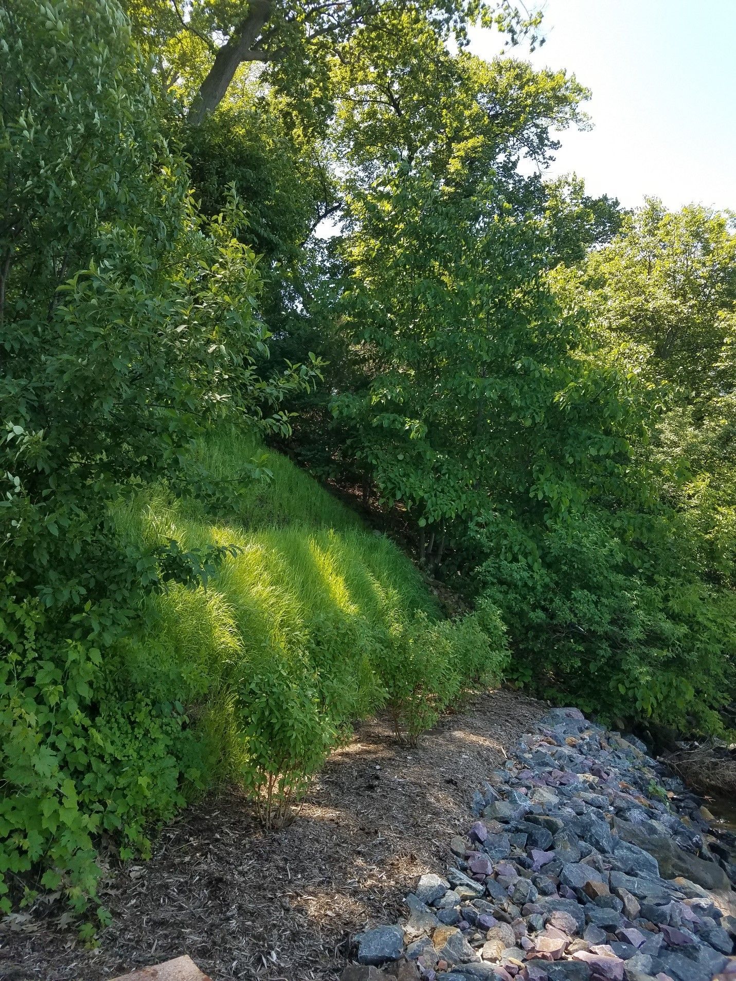 We turned this eroding weedy shoreline into a formal, terraced perennial-matted one! Vegetation and soil were removed from the slope. Terraces were then built by stacking sandbags and staking them in with mesh liner. Finally, native vegetative perennial mats were stapled into sandbags. One challenge was the long trek from the driveway to the very steep shoreline, which could not be accessed by vehicle. With help from shoreline experts, we set up a conveyer belt system to haul the sod rolls and sandbags. The slope is now locked in and efficiently prevents run-off while providing a stunning habitat for pollinators.