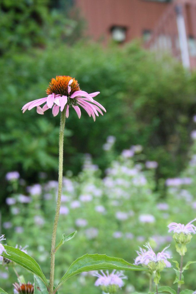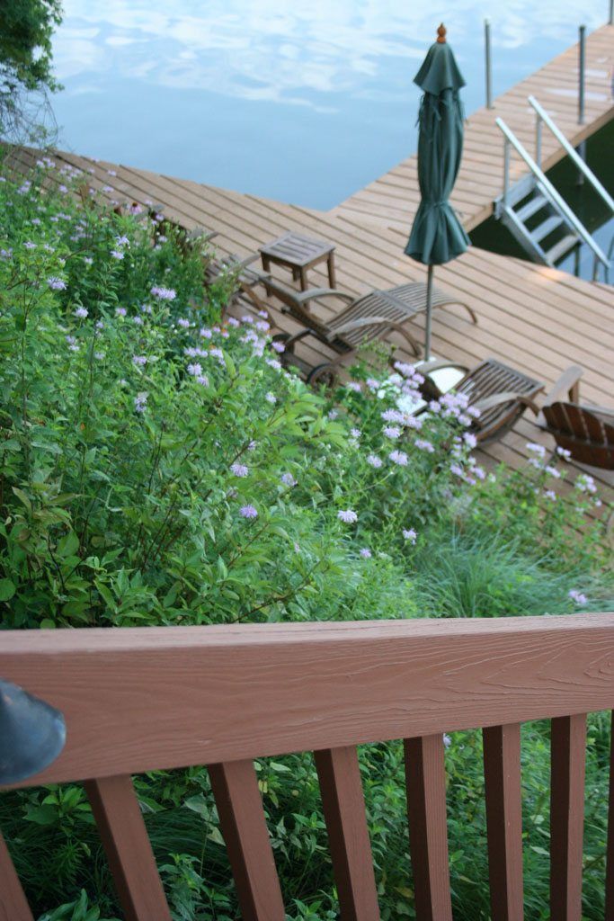 Steep slopes supported by multiple deteriorating railroad tie retaining walls and overgrown shallow-rooted vegetation at this vacation home on Whitewater Lake prompted a comprehensive design and strategic installation. Slopes were regraded and stabilized with a single timber retaining wall and overgrown shrubs were replaced with a diverse and highly showy blend of deep-rooted and drought resistant prairie plants. Photodegradable straw blankets and wattles were used to temporarily retain the slope while the native wildflower and grass planting became established. The new landscape created beauty, provides wildlife habitat, and requires less maintenance since the native plants do not require watering, mowing, or fertilization.