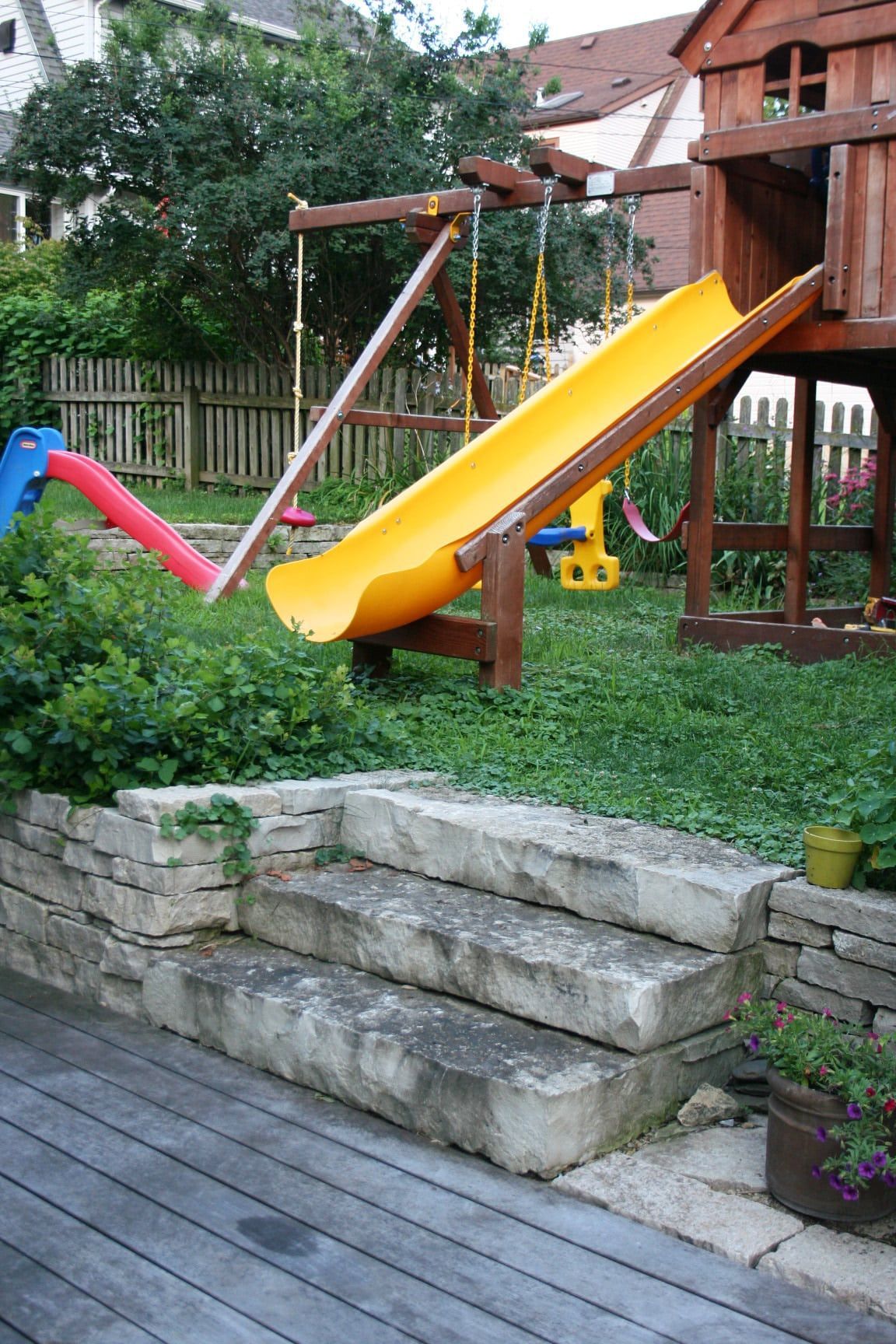 A newly remodeled bungalow home on a quaint city lot offered many opportunities for innovation and creativity. A redesigned driveway keeps the basement dry by improving stormwater management onsite and an additional set of steps enhance circulation to the front porch. Natural stone retaining walls accentuated with planting beds full of native wildflowers and grasses transform a steep sloping front yard into flat useable space while also adding curb appeal. In the backyard, a deck designed with sustainably grown Ipe lumber offers an area to entertain or relax while watching the kids play on the elevated low maintenance no-mow turfgrass area.