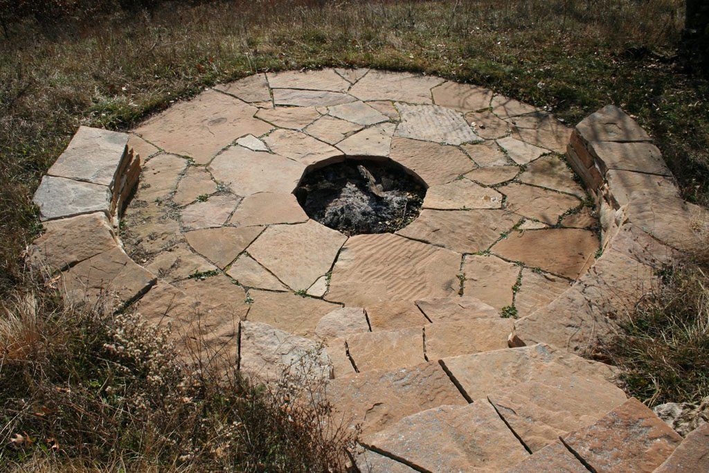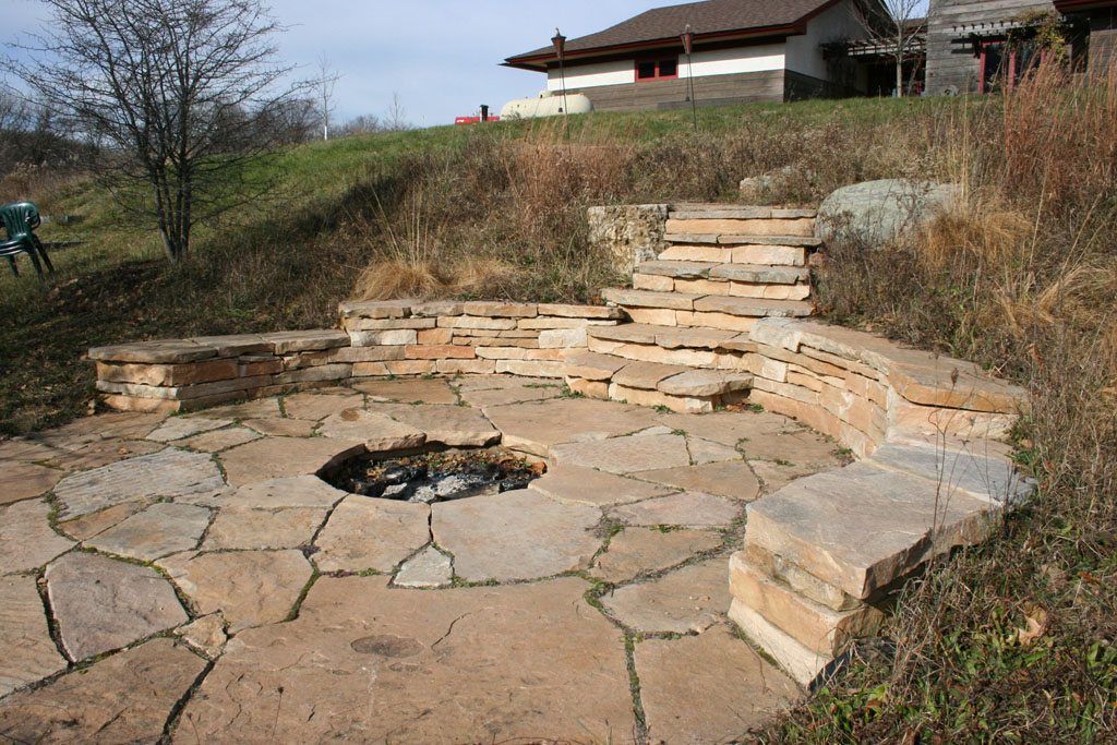 This home, designed by Lou Host-Jablonski of Design Coalition, is perfectly integrated with the site’s beautiful natural setting on a ridge overlooking rural Iowa County. Our designers were inspired by both the home and the site in locating and creating this gathering space. Nestled into the slope, this feature is hidden from the home and reveals itself to site visitors only as they walk the curving path. Stone benches and views of the surrounding valleys welcome visitors and a fire pit encourages them to stay for some nighttime relaxation. While creating the functionally perfect retreat, the dry-laid natural stone materials are regionally inspired and therefore fitting to the site – they echo the color and horizontality of the home while also hinting at the geography of the site.
