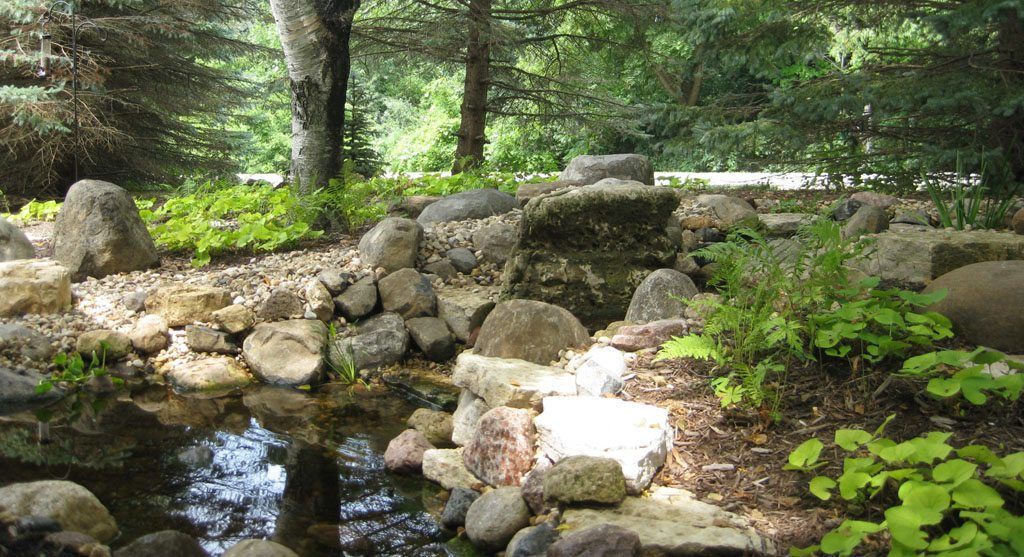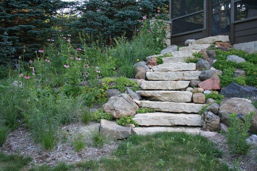 This site-wide design beautified the property and reduced maintenance, while enhancing ecological integrity. Sandy soil provided an excellent opportunity to introduce hardy native plants, which require less upkeep than non-natives. Sunny areas were converted to shortgrass prairie, providing a colorful and textural contrast to the evergreens bordering the site. Views from inside were considered in all design ideas. The kitchen windows, for example, overlook a welcoming front entryway with a meandering path, a flowing water feature and a woodland garden lush with ferns and ginger. Plentiful native flora and gurgling sounds of water ensure a private, serene experience with frequent visits by birds and other wildlife. The warm paint colors and natural stone facade of the home informed the colors and textures used throughout the design.