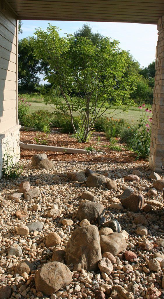 Having just moved from a home on Madison’s west side these clients were accustomed to a smaller, and more organized outdoor space, but now living in Verona on a larger & much more open property, they found they were in need of a different type of landscape. They wanted a setting that still focused on beauty & formality, but was also based in hardy plant selections with looser forms that could connect/relate to the larger natural surroundings. To accommodate, native perennials in combination with a few non-native, but non-invasive species, were selected to provide a bold & striking expression, while affording durability & lower maintenance. Strategically placed native shade trees connect and nestle this three story home to the greater landscape without obstructing views from inside. Boulders and rock gardens create permanent textural interest and in combination with perennial fall color, will provide needed multi-seasonal enjoyment.