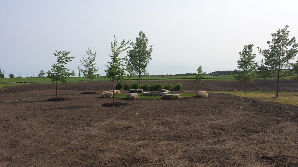 How simple it is to fashion natural stones into a pleasing seating space! But it all has to start with a plan of course. The most important component of this outdoor seating space was to get the scale right – we wanted this space small enough to be intimate & cozy, but large enough to be roomy & flexible. In this case the seats were made from locally quarried large natural stones, which are placed around a formal, but still natural, stone firepit. Each seating stone comfortably seats two people, with room left between each for additional seating. As a result this space can therefore handle small or large groups. Hardy, native trees encircle the space providing verticality & an overhead canopy for shade. Of course maintenance for the Midwest hardy native swamp white oak and hackberry trees is simple and easy. Lastly, we used Kentucky bluegrass, aka lawn, for the large green circle bordering the council ring or seating space. This will be mown regularly so keep the space ready for use!