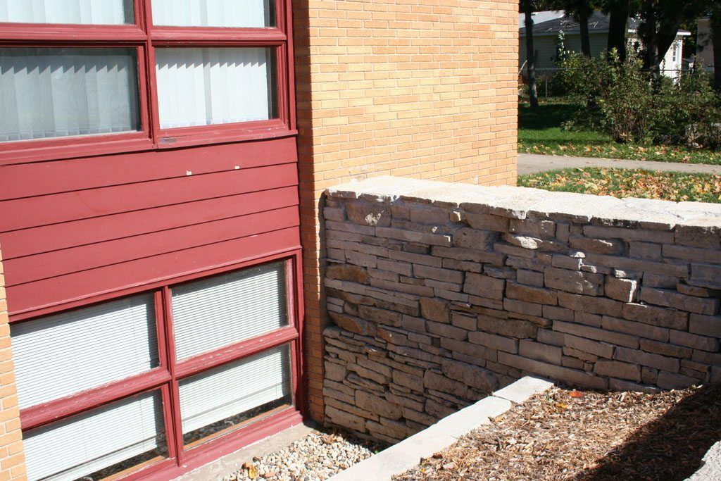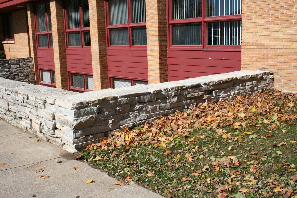 The architecture of this historical Frank Lloyd Wright inspired church features a terraced retaining wall that descends eight feet below grade to exposed basement windows. Through clever design, on the day of the winter equinox, the sun is allowed to shine over the wall and through the windows into the basement with perfect alignment. Unfortunately, the lower wooden wall was rotting and the natural stone wall above was settling due to a damaged water pipe near the foundation. Keeping the historical significance in mind, the failing stone wall was disassembled and precisely restored with existing salvaged stone and new carefully selected local stone, while the wooden wall was replaced with a matching durable natural stone wall. This flawless integration of materials and style showcases the professional hardscape craftsmanship of Formecology, LLC.