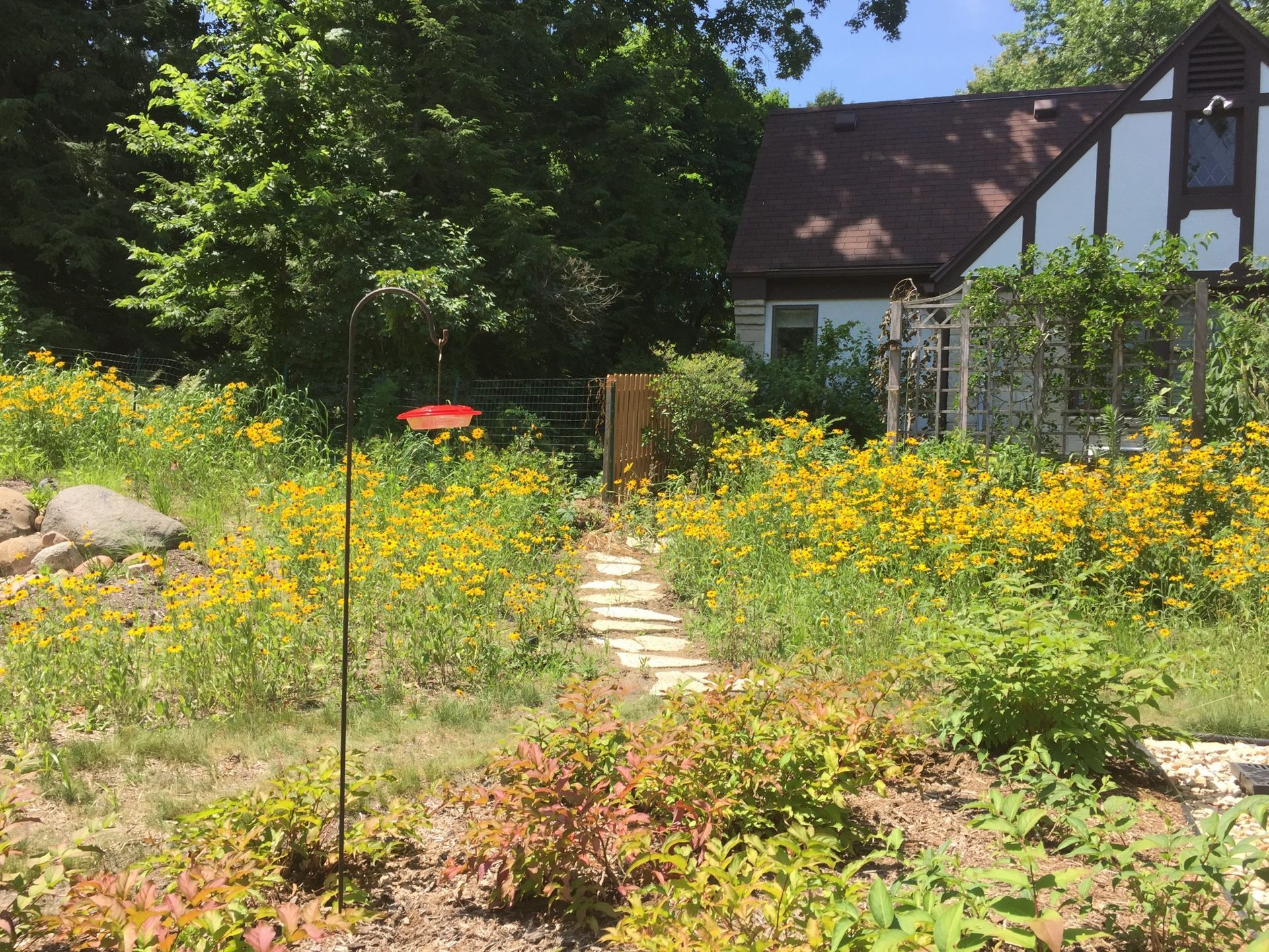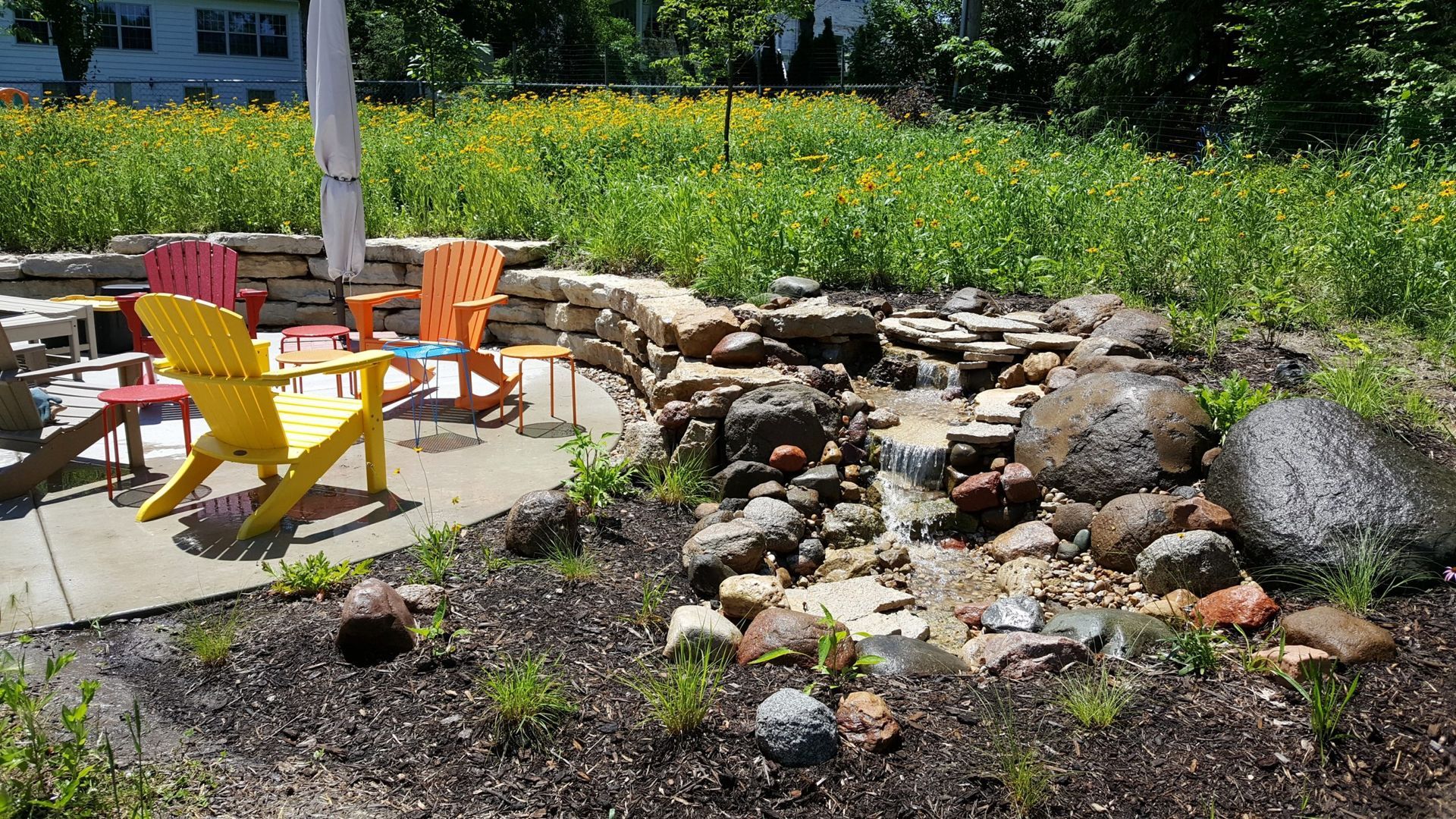 Clients were concerned about stormwater drainage issues and wanted a space to entertain. We came up with a plan to install prairie all around their home with pockets of turf lawn. We also installed a natural stone seating area with a pond feature. Clients are now able to enjoy the benefits of nature without leaving their city home.