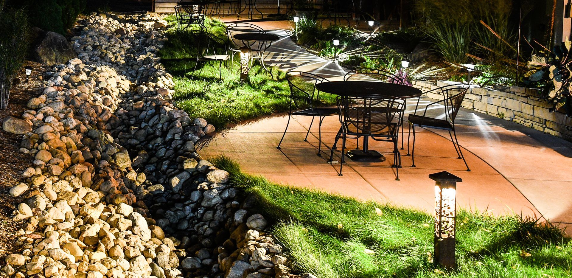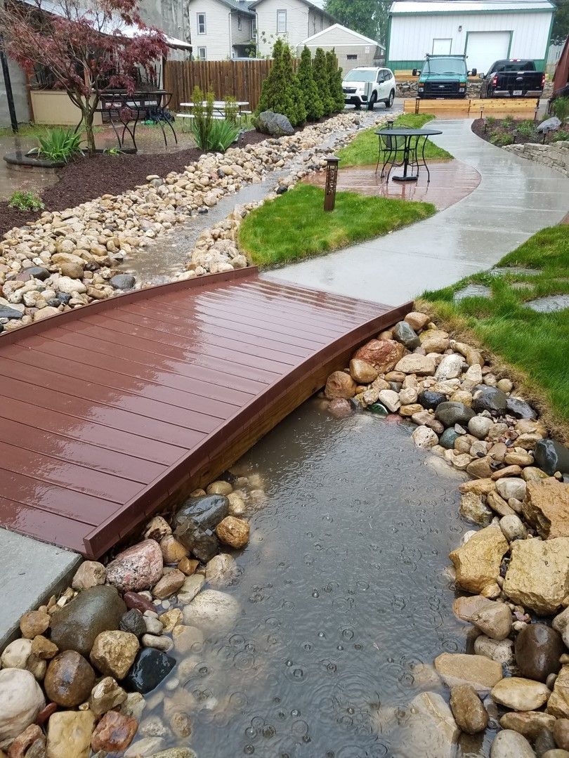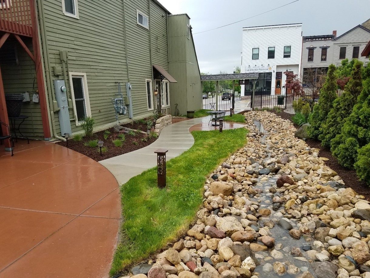 This farm-to-table bistro wanted a safe, ADA-accessible, low-maintenance, inviting outdoor space that tied well into their regionally based, historic building. Existing turf lawn was removed and an interactive, meandering armored cobble swale along with a bridge, steppingstones, and a lush no-mow turf lawn was installed in place. Native pollinator-friendly perennials were placed in the organic hardwood mulch beds. Stunning nature-inspired accent lights illuminate the space allowing community members to gather after business hours. A circular dyed concrete patio strategically separates the gray walkways. All materials were locally sourced and the entire block’s water is now managed.